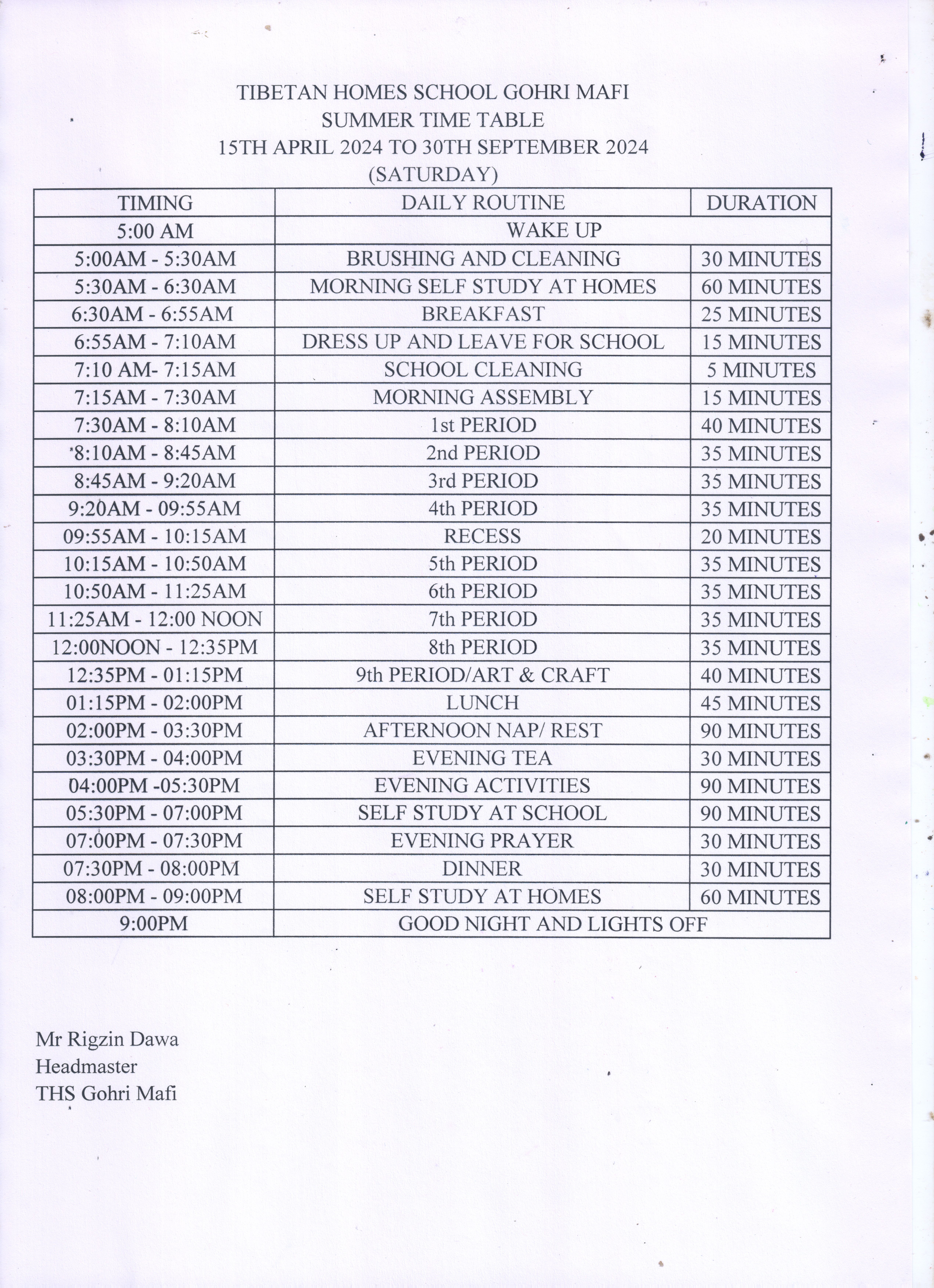 Summer Time Table