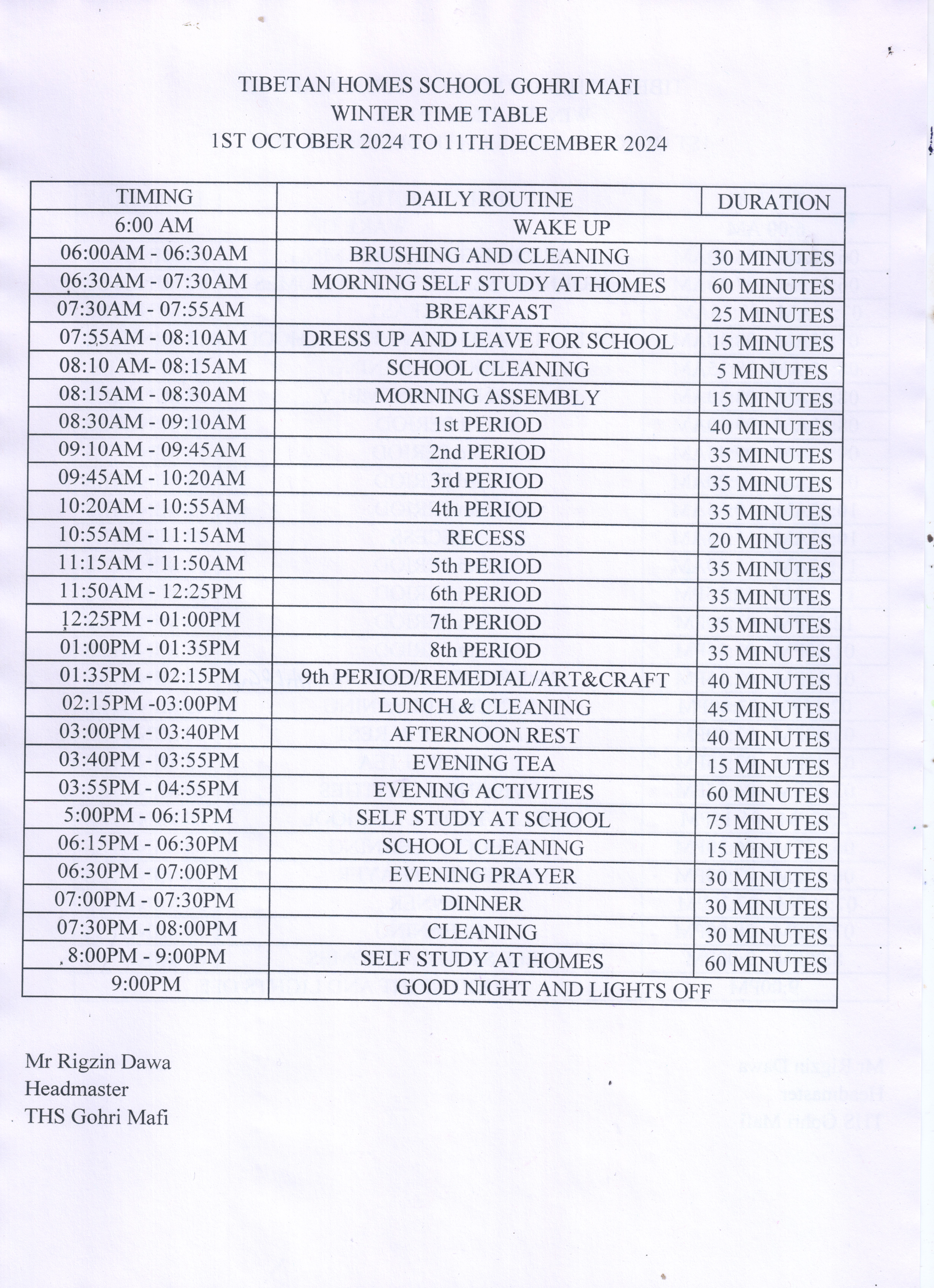 Winter Time Table